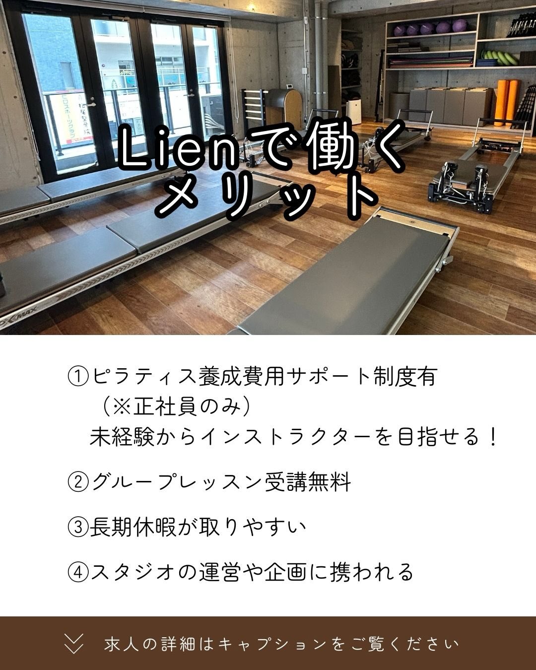 ピラティス&ヨガスタジオにて、レッスン事業拡大につき、一緒にスタジオを盛り上げてくれる正社員を募集いたします。資格をお持ちでない方も、アカデミー養成コースがあるリアンなら未経験からでも安心です。